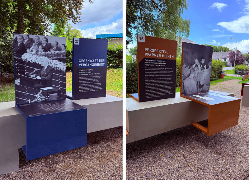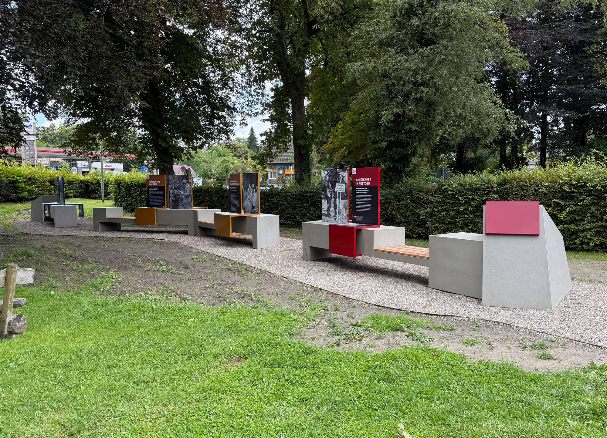 Am 2. September 1944 überschritten hier US-Truppen die Grenze des deutschen Reiches. Somit war Roetgen die erste vom Nazi-Terror befreite deutsche Ortschaft. Daran erinnert dieser neue Ort gegen das Vergessen. Entwicklung von mehreren Ausstellungssegmenten auf denen mit Fotos, großen Schautafeln und Texten der historische Ort lebendig wird. Ein QR-Code lädt ein zur Web-App mit Filmen, Audiofiles und vertiefenden Informationen in vier Sprachen.