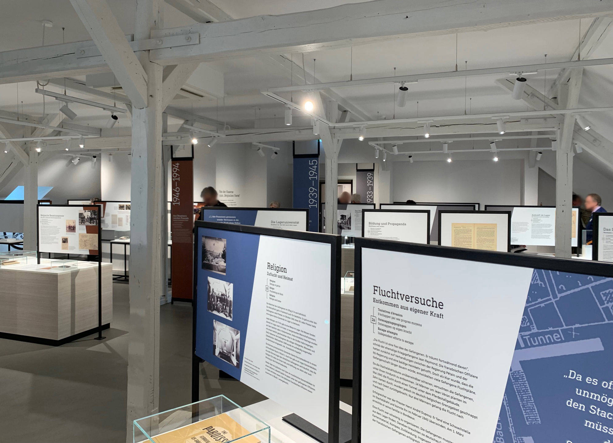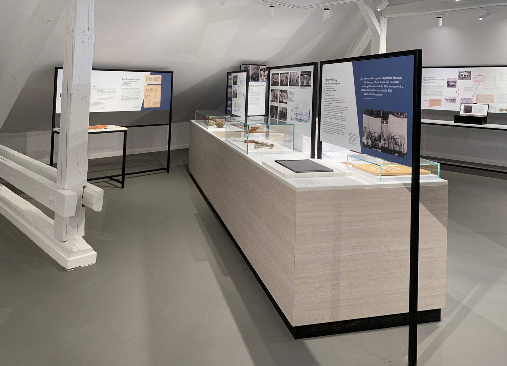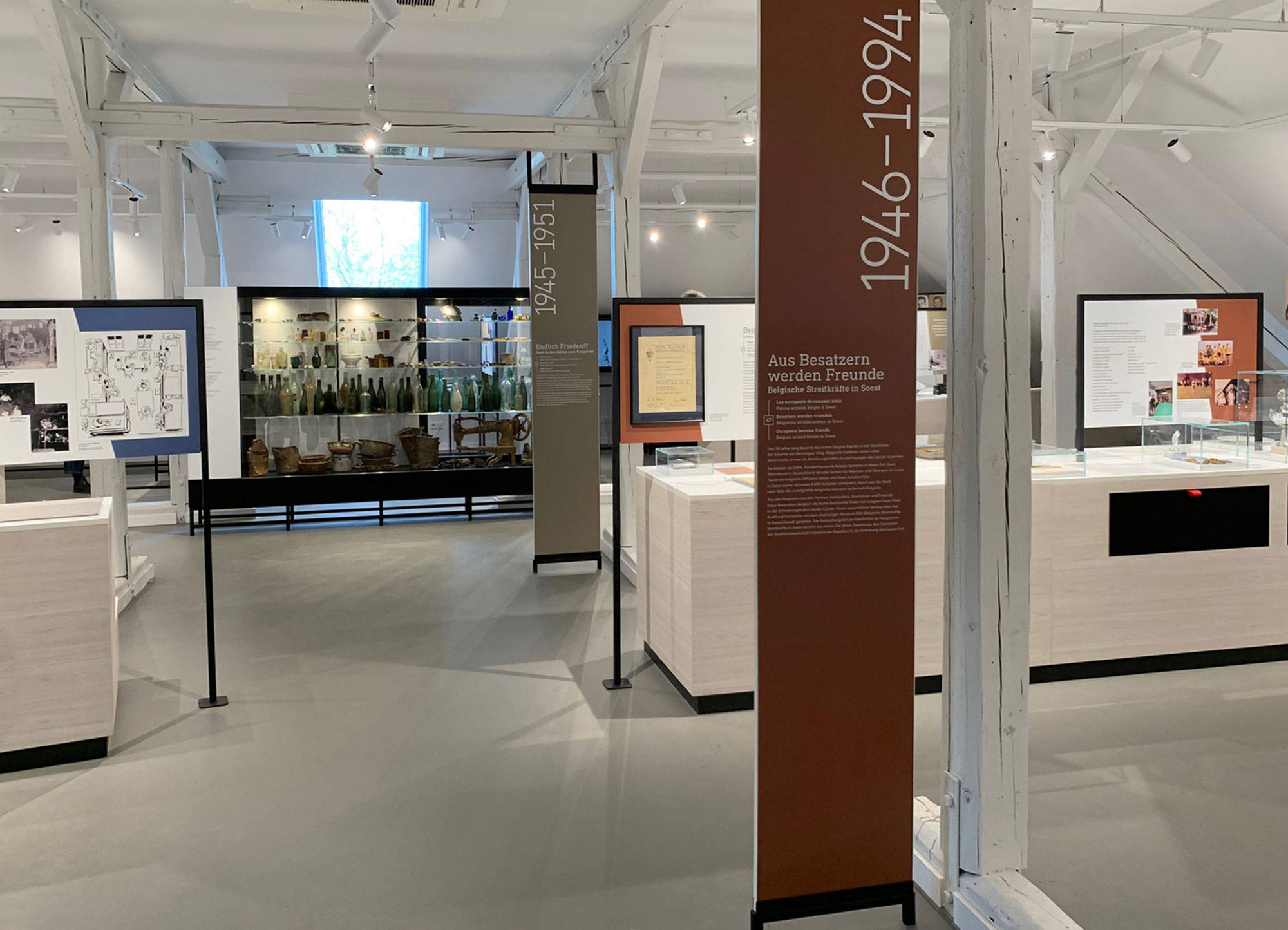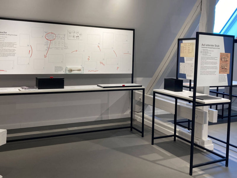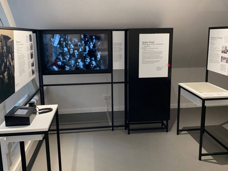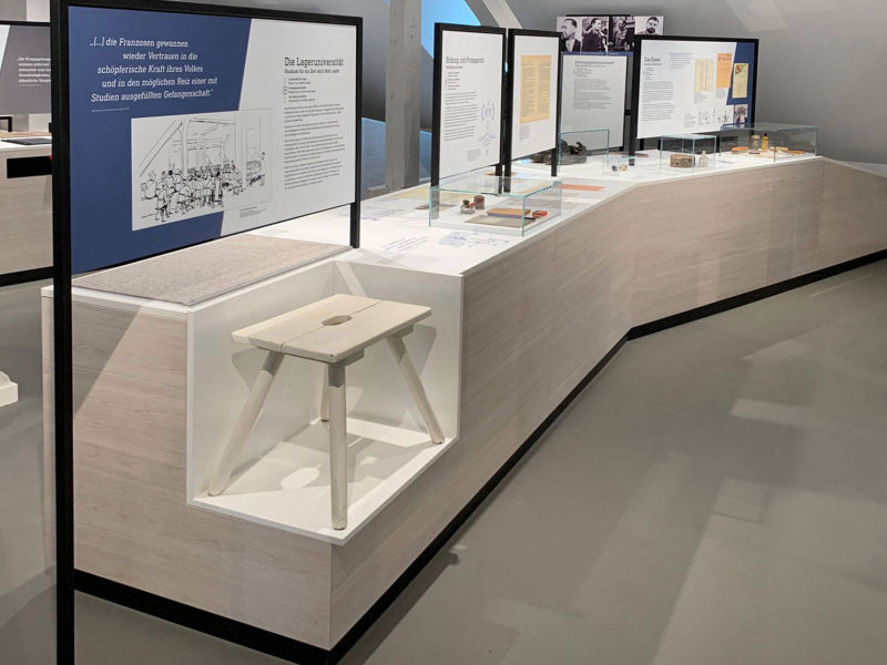 Im Obergeschoss der ehemaligen Kaserne in Soest entstand in einem herausfordernden Raum mit Ständerwerk und Schrägen eine neue Dauerausstellung. Thekenelemente mit Bild-Texttafeln gliedern den Raum, während Biografiestelen persönliche Geschichten nahebringen. Interaktive Medienstationen mit Film, Audios und Informationen ergänzen die Ausstellung und erzählen die aussergewöhnliche Geschichte des Ortes.