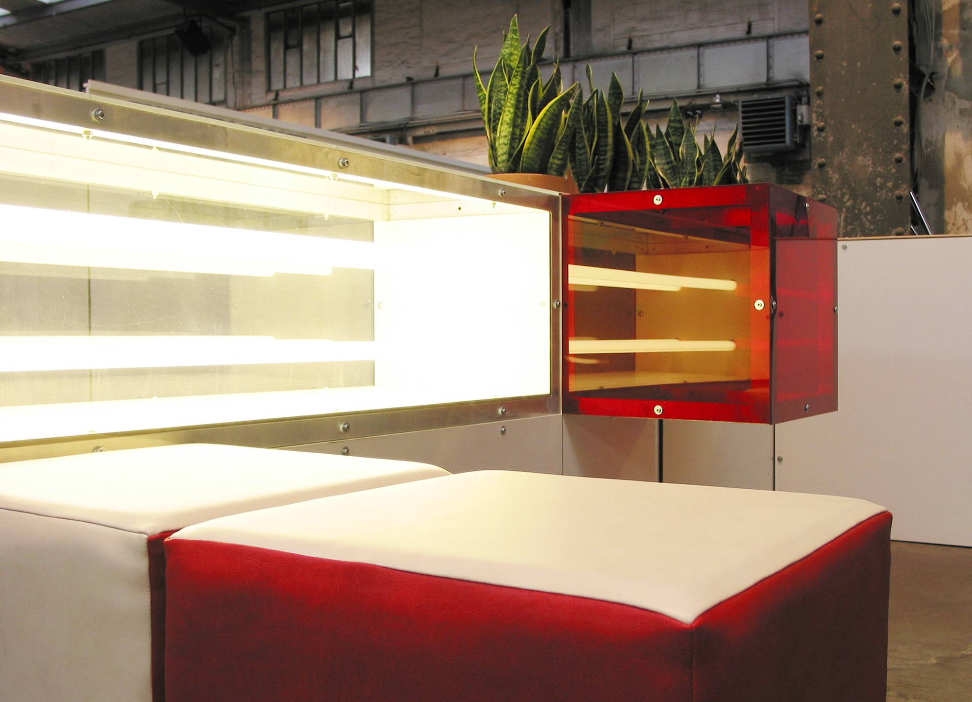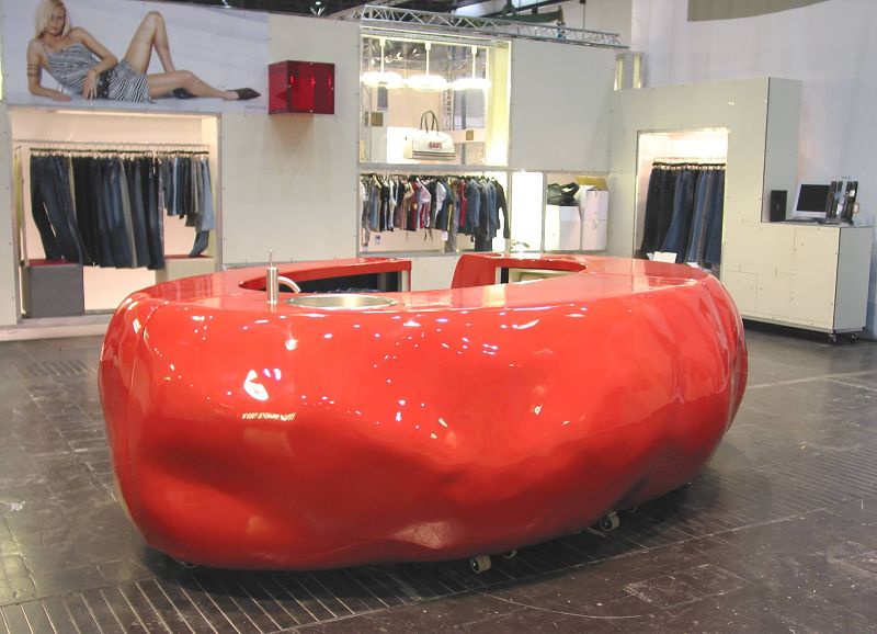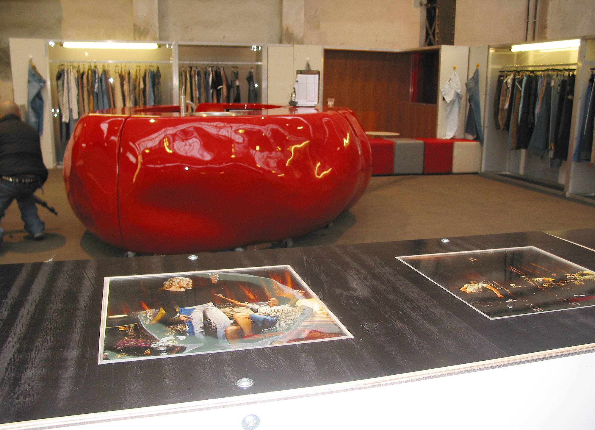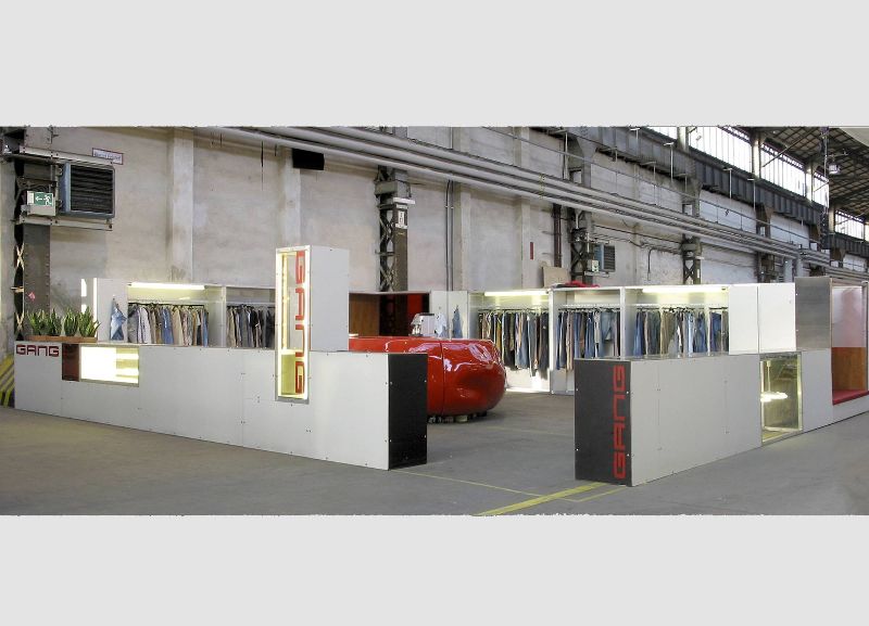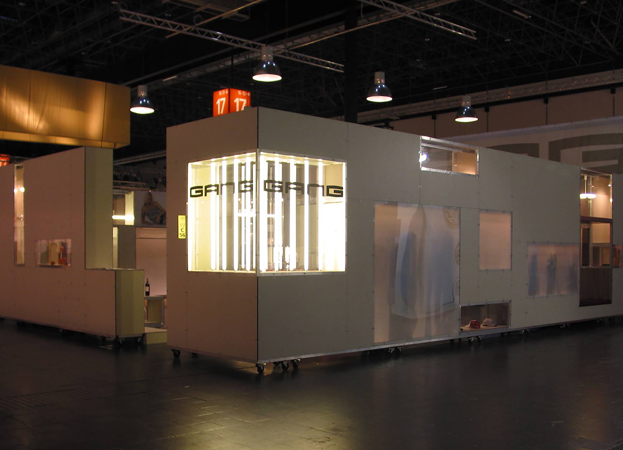 Entwicklung des Messestands der Bekleidungsfirma "gang" für die CPD und die Bread & butter, Streetwearmessen. Um die zentral als Fixpunkt konzipierte Theke aus Glasfaserkomposite befinden sich die je nach Standbedürfnissen zu montierenden Wandelemente zur Präsentation der Kollektion. Auf den Messen erregte die hochglänzende Theke Einiges an Aufsehen und wurde entsprechend als Komunikationspunkt von den Kunden des Modehersteller als Anlaufstelle genutzt. Die modulare Bauweise des Messestandes lässt sich leicht auf die Gegebenheiten des jeweiligen Messeorts anpassen.
