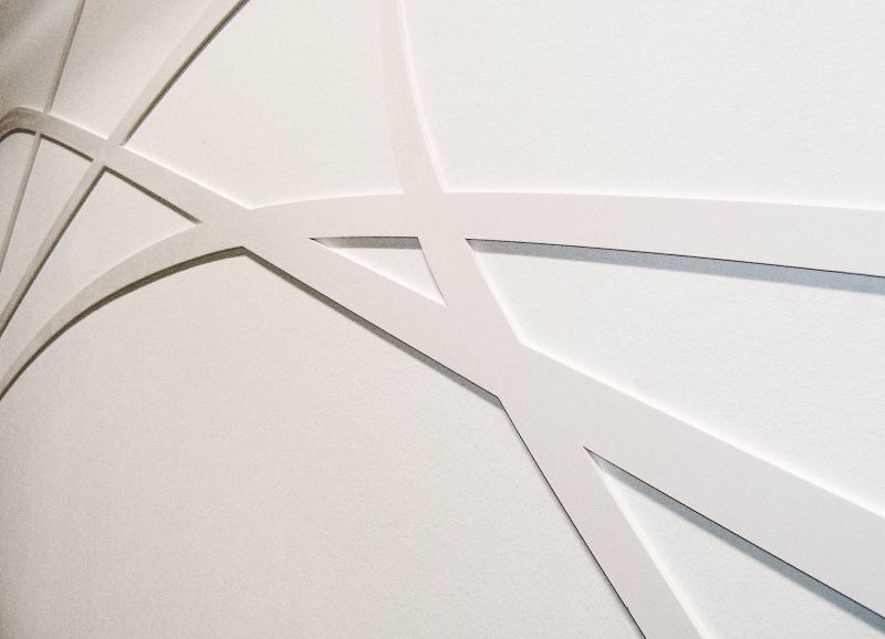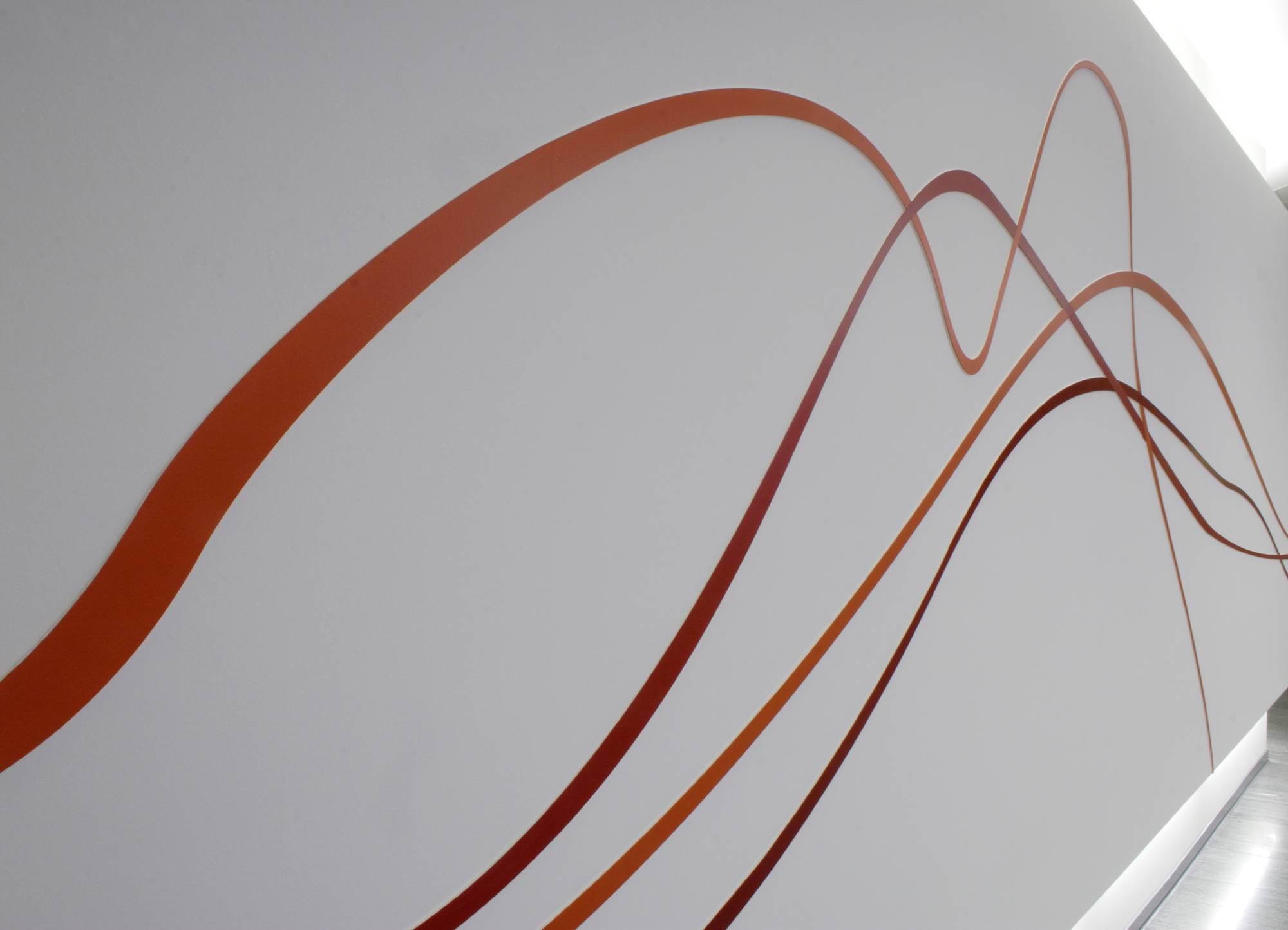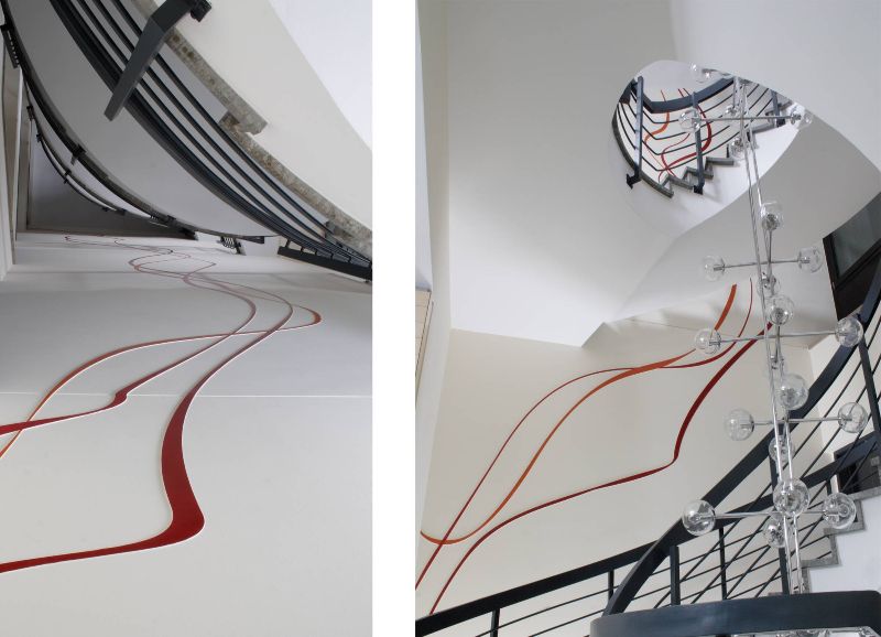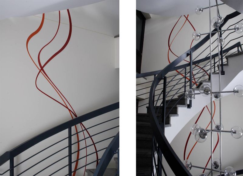 Die Form der Wendeltreppe, die das Hauptgebäude der Volsbank erschließt, aufnehmend wurde die Wand des Tresorraumes in der Haupthalle und die Wände des Treppenhauses mit geschwungenen Farblinien gestaltet. Die künstlerische Gestaltung ist als Halbrelief gearbeitet und in Lack farblich gefasst.